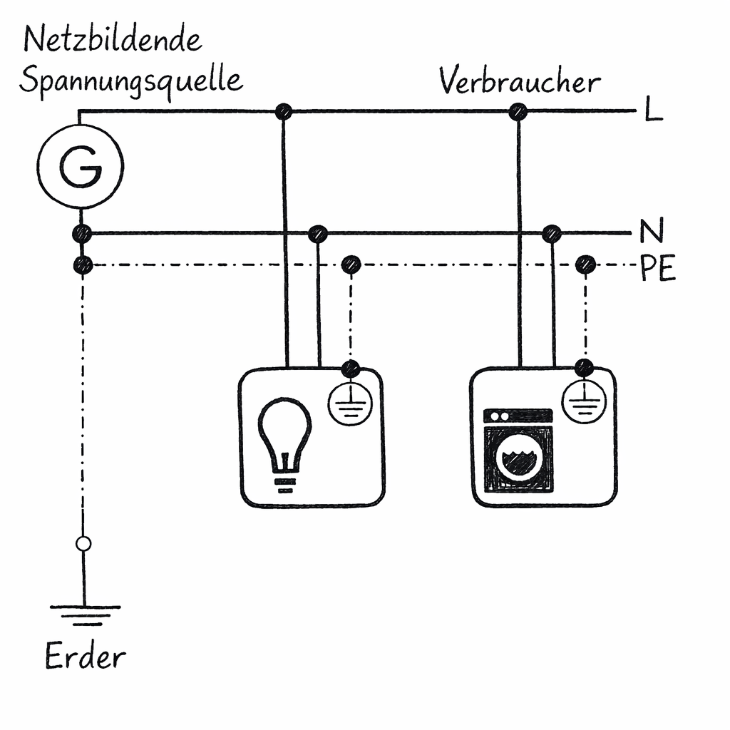 Die sicherheitstechnisch wichtigste Überlegung des Insel-Stromsystems ist die korrekte Erdung. Es gibt mehrere korrekte und legale Möglichkeiten, aber ich empfehle das TN-C-S-System (französisch: Terre Neutre Combiné Séparé). Dieses ist im Fehlerfall extrem sicher und benötigt nur den einen schon vorhandenen Erder, an dem im Netzbetrieb PE hängt.