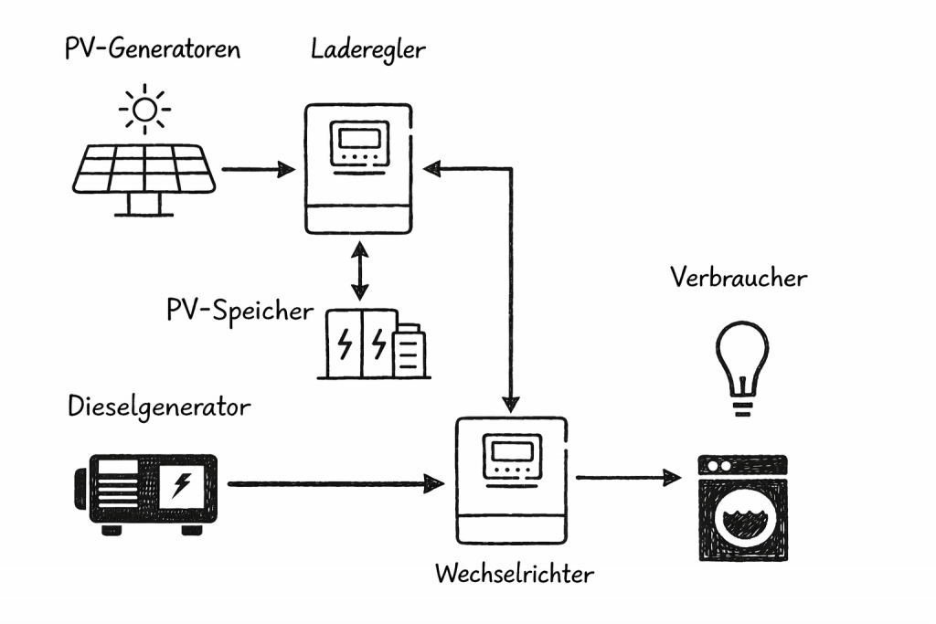 - Genügend Platz für PV-Speicher, Wechselrichter, Dieselgenerator, Pufferspeicher