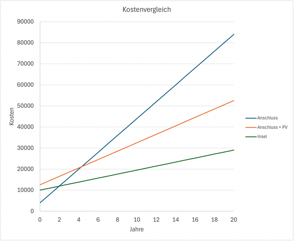 Mit einem konventionellen Stromanschluss und ohne PV gibt es lediglich die Anschlussgebühren als Investitionskosten mit ca. 4000 €. Bei einem Strompreis von 40 ct pro kWh ergeben sich jährliche Kosten von 4000 €.