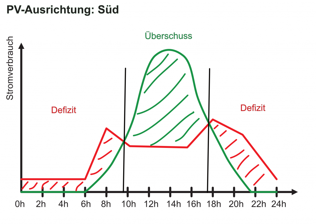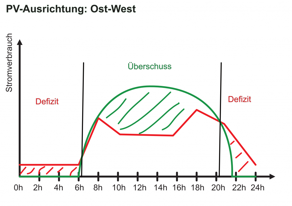 Obwohl bei der Ost-West-Ausrichtung niemals die Spitzenleistung der Module (kVp) erreicht wird, ist die Nutzung des Stroms deutlich besser — es können größere Teile des Tages komplett mit PV versorgt werden. Dies liegt daran, dass die Ost-West-Ausrichtung der PV-Module die Stromerzeugungskurve zwar abflacht, aber auch verbreitert (da die Morgen- und Abendsonne besser genutzt wird).