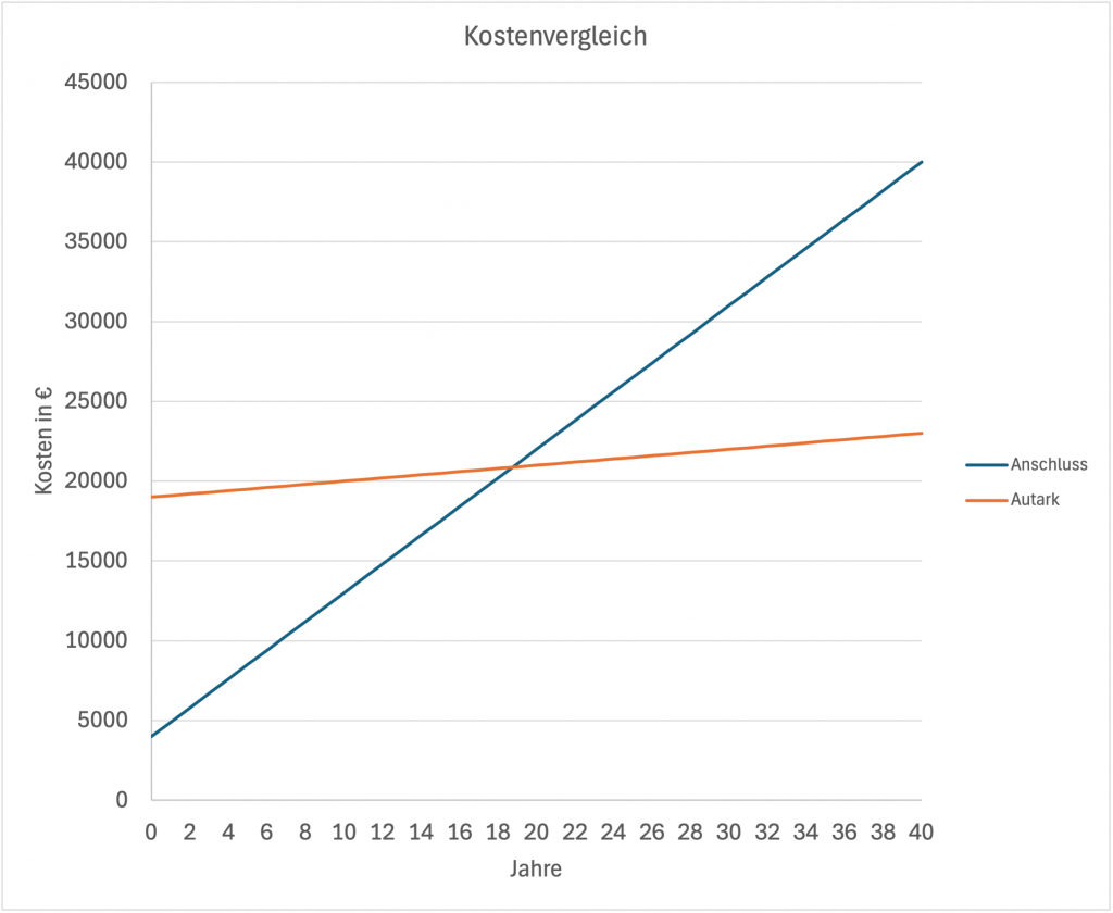 Ein typischer Wasseranschluss kostet 4000 € (kann aber auch viel teurer sein). Ein Liter Wasser kostet typischerweise 0,4 Cent. Damit kommen wir auf 900 € Wasserkosten im Jahr.